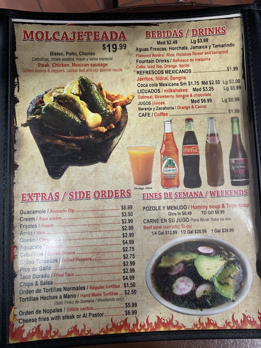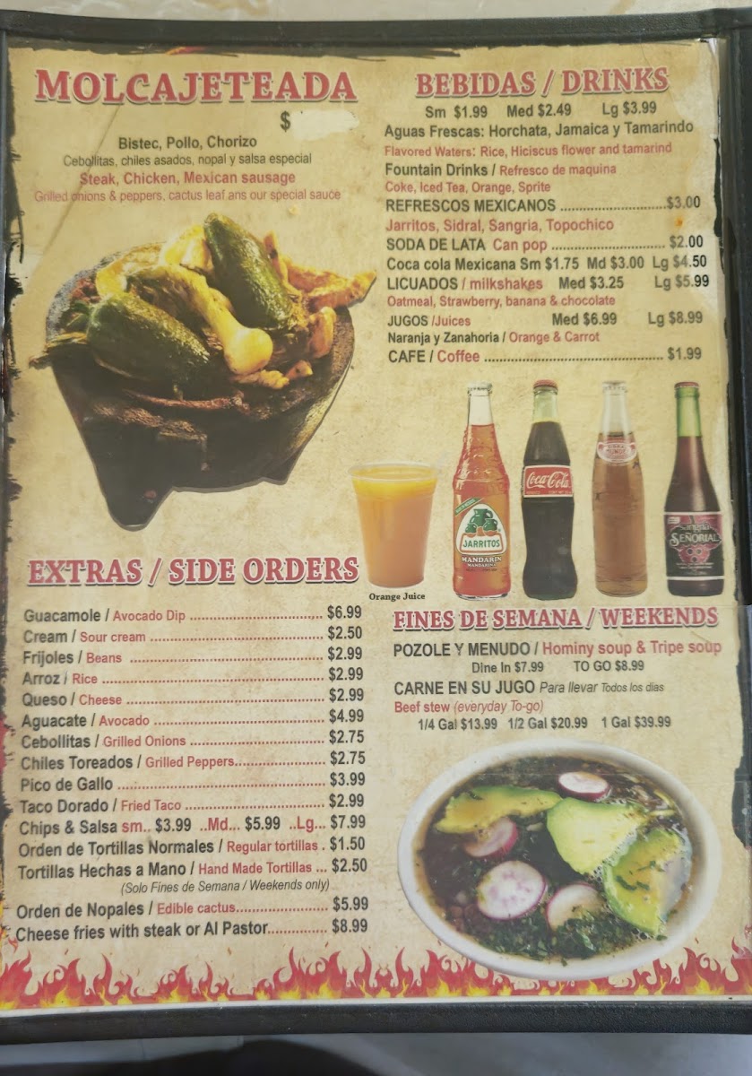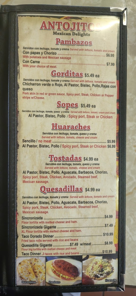 Servidos con lechuga, tomate y crema served with lettuce, tomato and cream. Chicharron verde o rojo, al pastor, bistec, pollo, rajas con queso *lengua add $1 extra pork skin in red or green sauce, spicy porl, steak, chicken or pepper strips w/cheese.